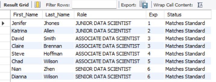 When Exp <= 2 and Role = ‘Junior Data Scientist’ Then ‘Matches Standard’