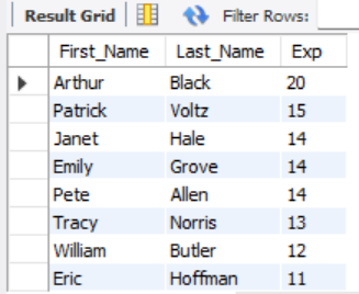Select EMP_ID, First_Name, Last_Name, Exp,