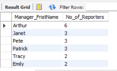 Q.6 Write a query to list only those employees who have someone reporting to them. Also, show the number of reporters (including the President).