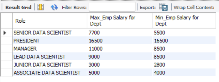 Q.9 Write a query to calculate the minimum and the maximum salary of the employees in each role. Take data from the employee record table.