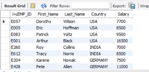 EMP_ID, First_Name, Last_Name, Country, Salary