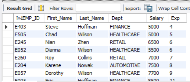 Select EMP_ID, First_Name, Last_Name, Dept, Salary, Exp From emp_record_Table
