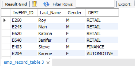 Select EMP_ID, First_Name, Last_Name, Dept From emp_record_Table