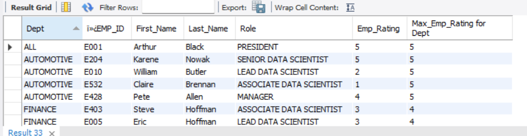 Max(Emp_Rating) Over(partition by Dept) As “Max_Emp_Rating for Dept”