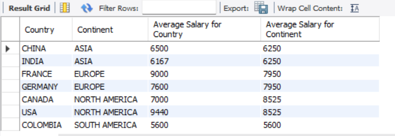 Round(Avg(Salary) Over(partition by Continent)) As “Average Salary for Continent”