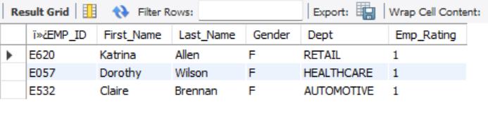 Select EMP_ID, First_Name, Last_Name, Gender, Dept, Emp_Rating
